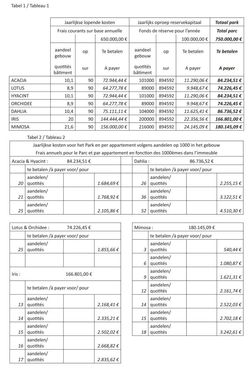 Acacia et Hyacint interviennent chacun pour 10,1/90, Lotus et Orchidee interviennent chacun pour 8,9/90, Dahlia pour 10,4/90, Mimosa pour 21,6/90 et Iris pour 20/90. Pour les résidences, on calcule notre participation en millièmes.